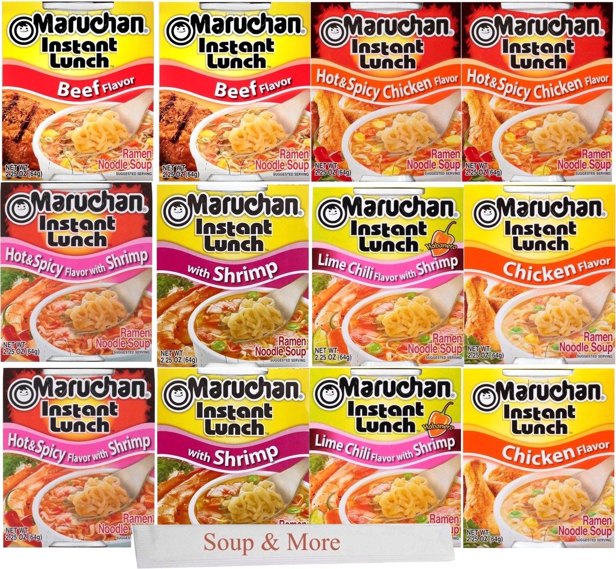 - Includes 2 - 2.25 Maruchan Instant Beef Flavor cups, 2 – 2.25 Maruchan Instant Shrimp Flavored Cups, 2 - 2.25 Maruchan Instant Chicken Flavor cups and 2 - 2.25 Maruchan Instant Hot & Spicy Shrimp, 2 - 2.25 Maruchan Instant Hot & Spicy Chicken Flavor cups, 2 - 2.25 Maruchan Instant Lime Chili Chicken Flavor cups
