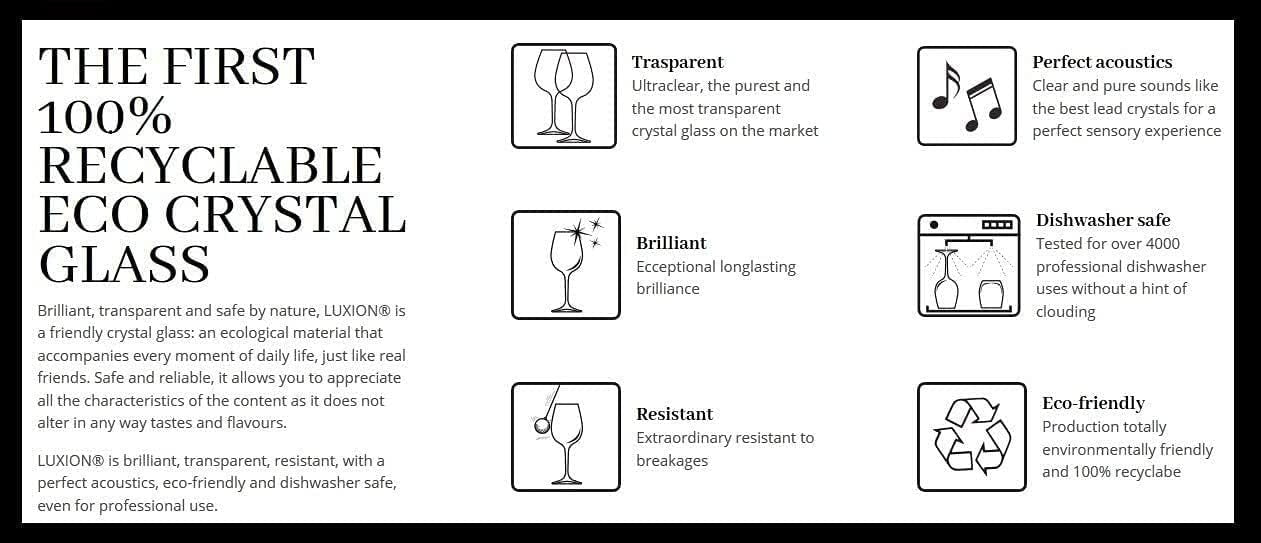 - RCR Luxion Eco-Crystal is known for being the highest quality with excellent clarity, sparkling glasses, and is made in an environmentally friendly way